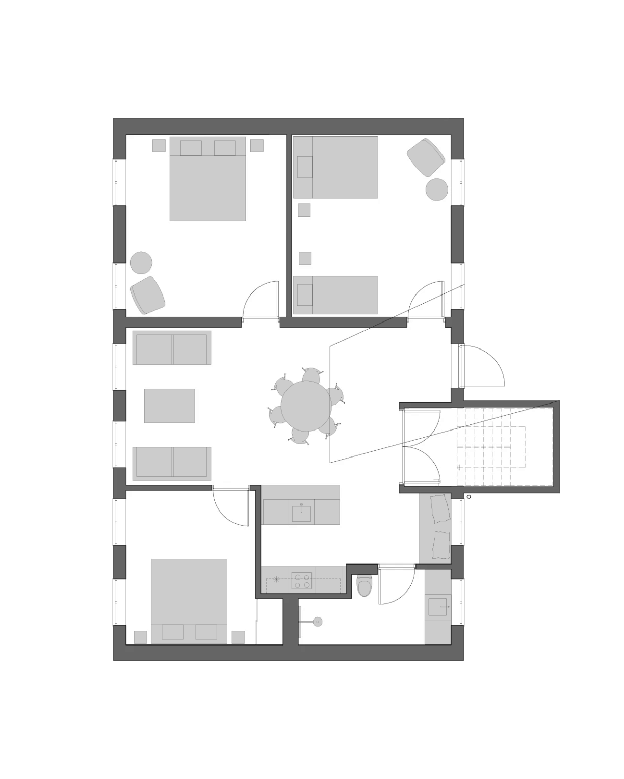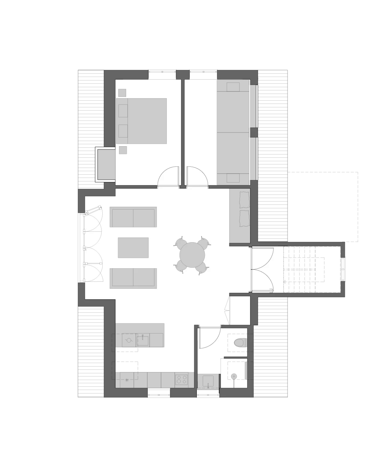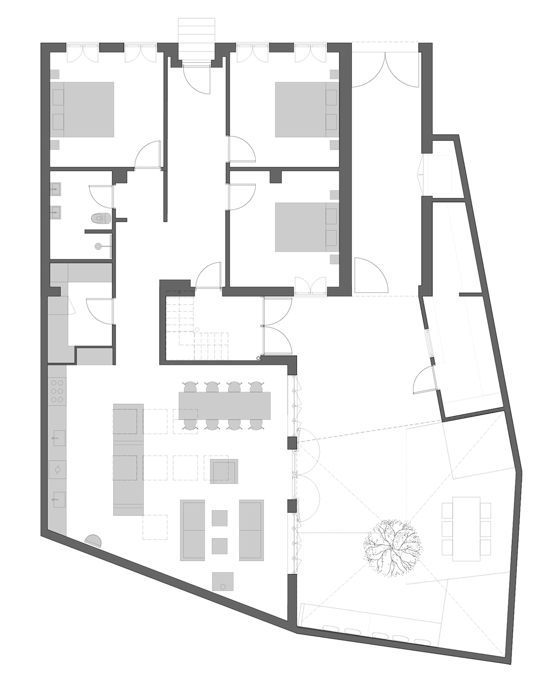 The enclosed courtyard is shared by all apartments – a peaceful oasis where the large fig tree casts its broad shadows. It is a place for a quiet moment in a sun lounger or for dinner under the open sky. The courtyard’s various seating areas allow you to be on your own or gather with others, and with both an Ofyr and a Yakitori grill, there is good opportunities to prepare a meal using local ingredients from the island.